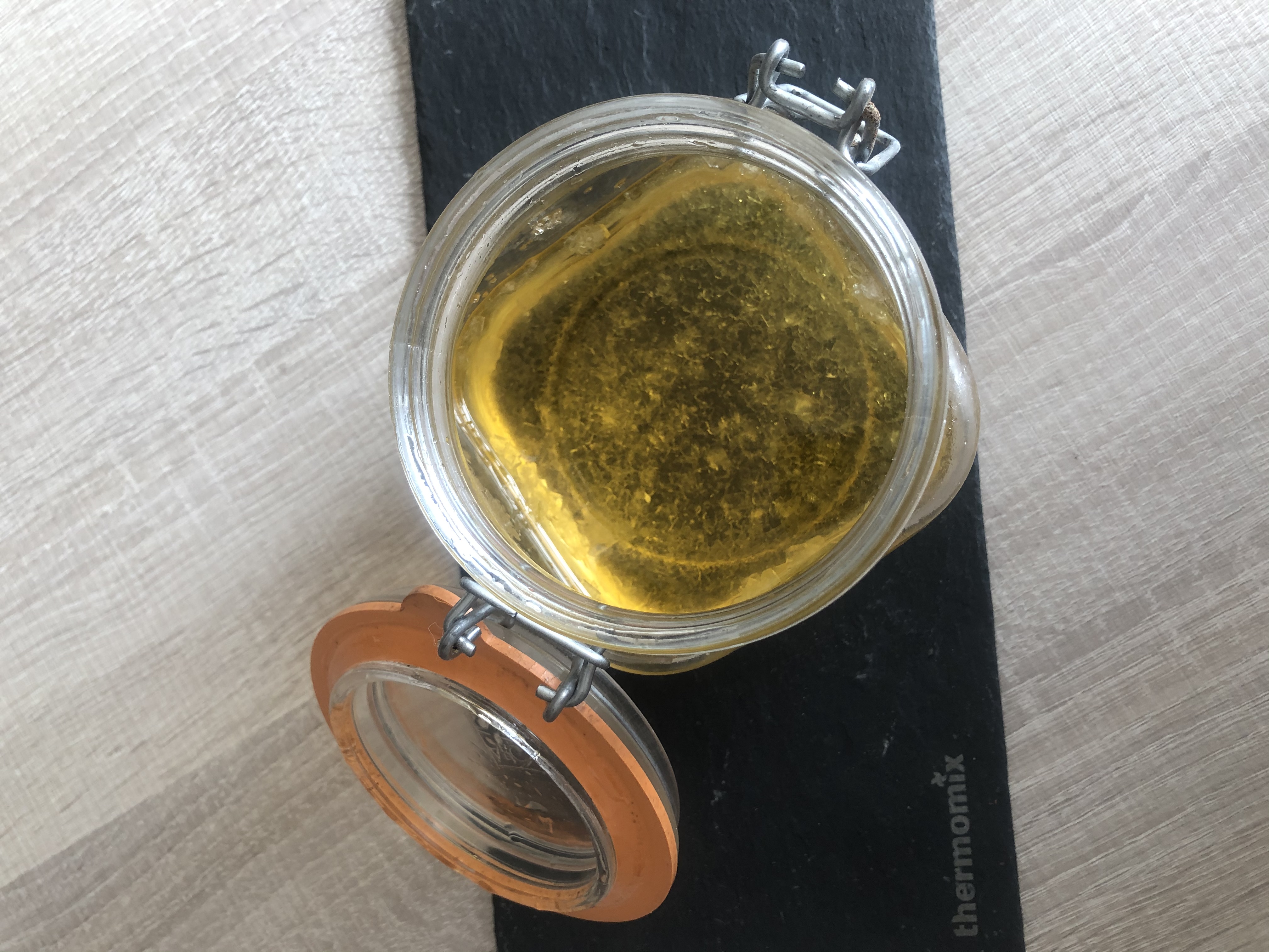 4-Incorpora el sobre de gasificante (bicarbonato) reservado y mezcla 1 min/vel 4. Vierte en un tarro de cristal o recipiente hermético, después de un pequeño reposo se vuelve transparente y si tiene espuma, retírala con una cuchara. Reserva a temperatura ambiente en un lugar oscuro o en el frigorífico y utiliza como ingrediente en tus elaboraciones.