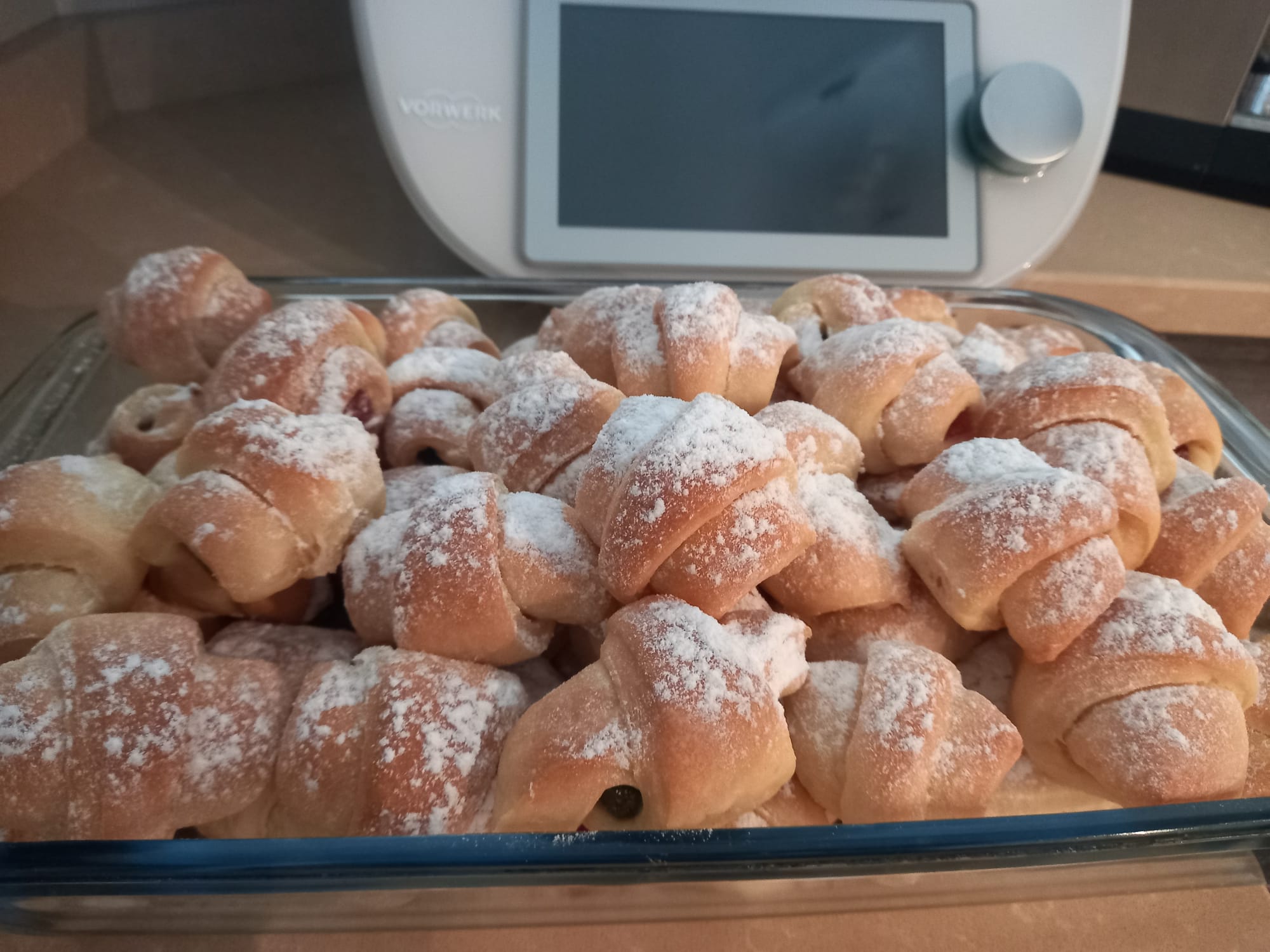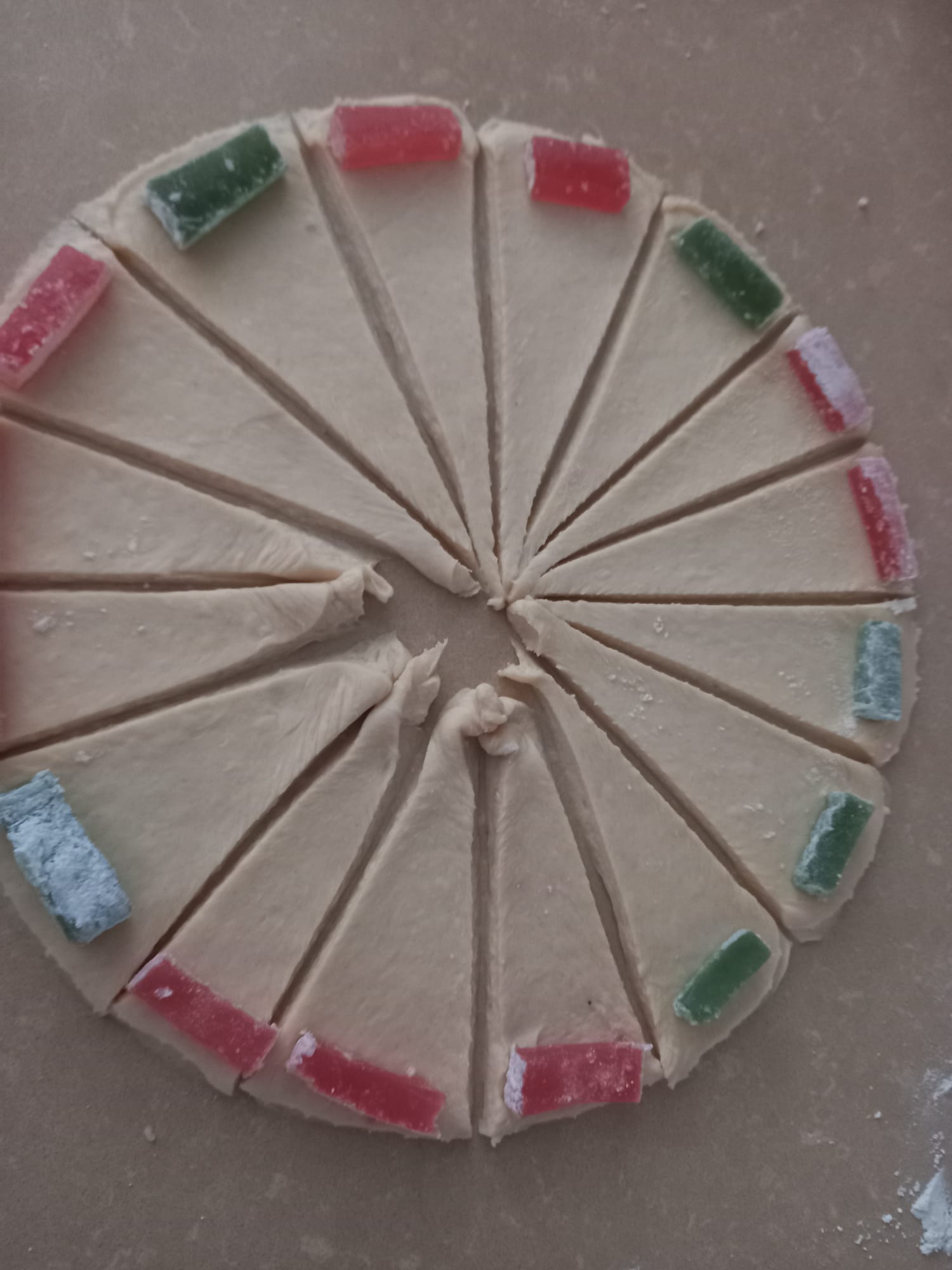 6. Pasado el tiempo de reposo se coge la bola y se divide en 2 partes, se extiende encima de una encimera con la ayuda de un rodillo de masas hasta obtener un grosor de 1cm. Para darle una forma exacta se le pone un plato llano encima de la masa y se recorta redondo. Después se corta en 4 partes iguales y cada cuarto se vuelve a cortar en 2 partes. Se rellena a gusto de cada uno...mermelada(tiene que ser una mermelada espesa), chocolate, o rahat (un dulce típico rumano que lo podéis encontrar en muchas tiendas rumanas). Se enrollan empezando por el lado mas extenso hasta la punta.
