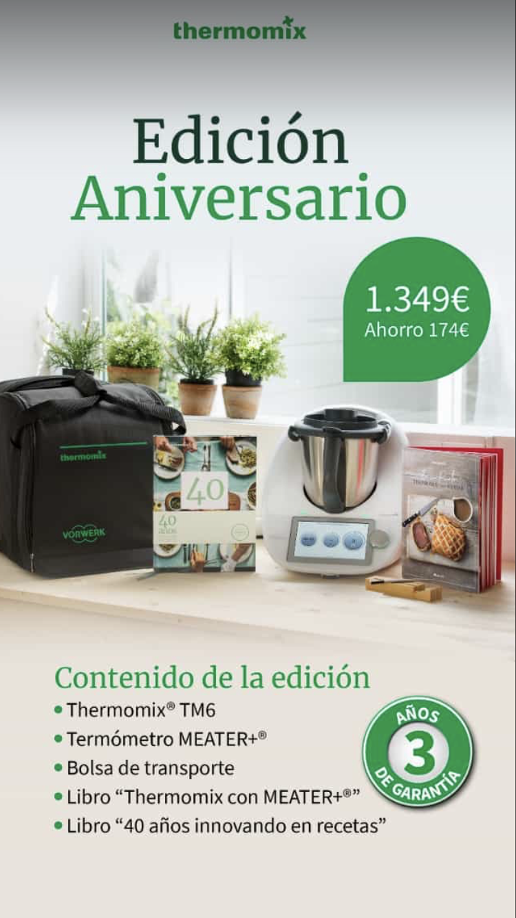 ESTE AÑO THERMOMIX CELEBRA SU 40 ANIVERSARIO Y NO LO PUEDE HACER DE OTRA MANERA QUE OFRECIENDONOS ESTA GRAN EDICION QUE ADEMAS DE INCLUIR DOS LIBROS TOTALMENTE NUEVOS Y LA BOLSA DE TRANSPORTE QUE TANTO NOS GUSTA PARA IR CON NUESTRO THERMOMIX A TODOS LADOS, NOS TRAE UN MEATER, Q ES UN TERMOMETRO PARA CARNES Y PESCADOS QUE SE PUEDE METER EN EL HORNO O EN LA PARRILLA PARA QUE LA TEMPERATURA DE NUESTROS PLATOS SEA PERFECTA Y QUE LA CONTROLAREMOS A TRAVES DE UNA APLICACIÓN Y LO MÁS IMPORTANTE ¡¡¡¡¡¡¡¡ 3 AÑOS DE GARANTIA !!!!!!!
