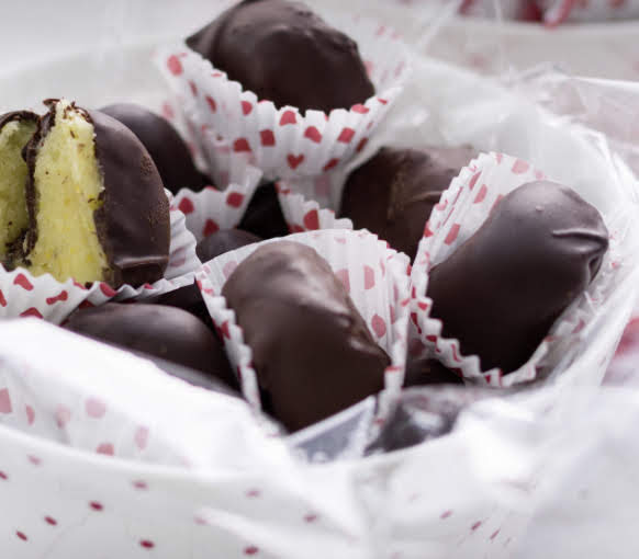 7. Reboce las rodajas en el chocolate, déjelas escurrir bien y colóquelas en vertical sobre papel de hornear hasta que se solidifiquen. Reserve en el frigorífico durante 30 minutos y sirva o envase a su gusto para regalo.