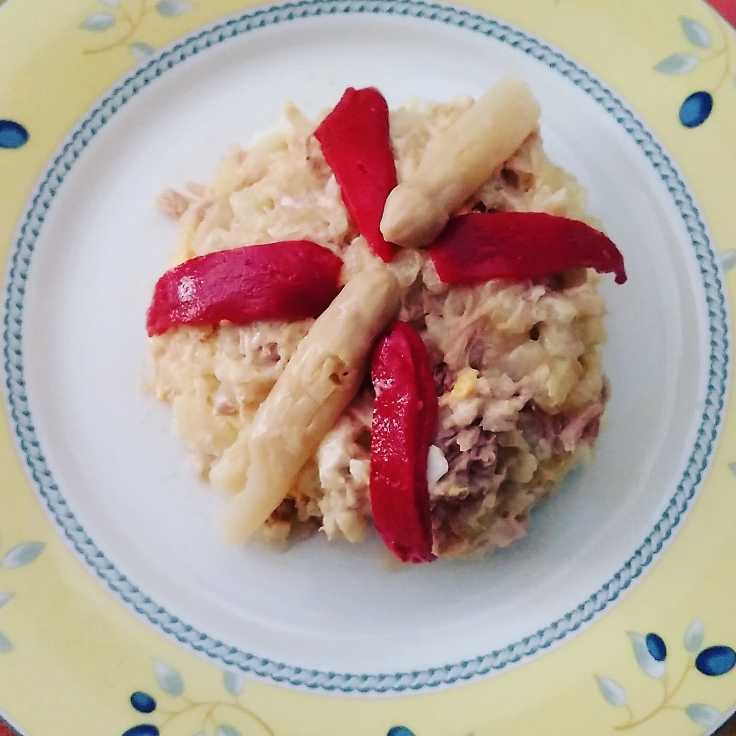Cuando esté fría mezclar con el atún, los huevos, las aceitunas y la mayonesa. Decorar con unas tiras de pimientos y unos espárragos.