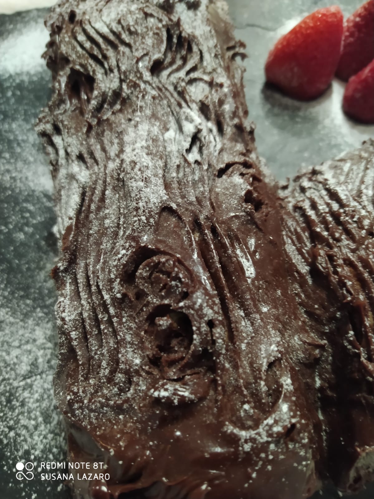 En mi caso, además, lo espolvoreo con un poco de azúcar glas imitando la nieve y decoro con frutas rojas.