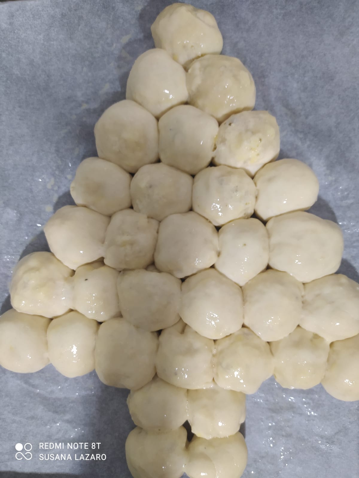 Después de fermentar, divide la masa en 32 bolas iguales. Estíralas en forma de disco de 8 cm y rellena con una cucharilla de la mezcla de quesos. Cierra el disco haciendo una bola (tipo bollo preñado). Coloca las bolas en la bandeja de horno dándole forma de Árbol de Navidad. Dejar reposar tapado con papel film en un sitio cálido durante 30 minutos.