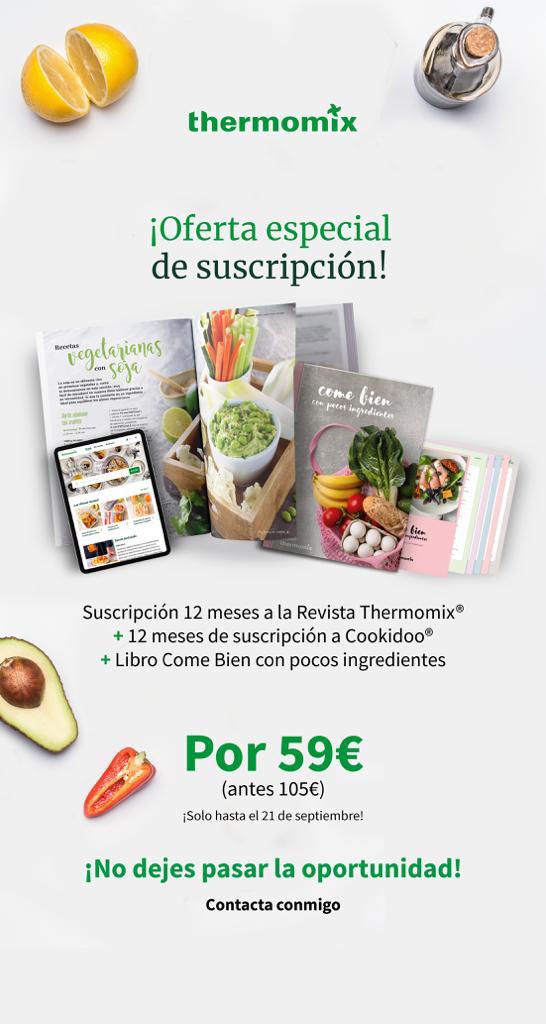12 números de la revista Thermomix y de regalo, el libro "Come bien con pocos ingredientes" y un año de Cookidoo. Todo por 59 euros.
