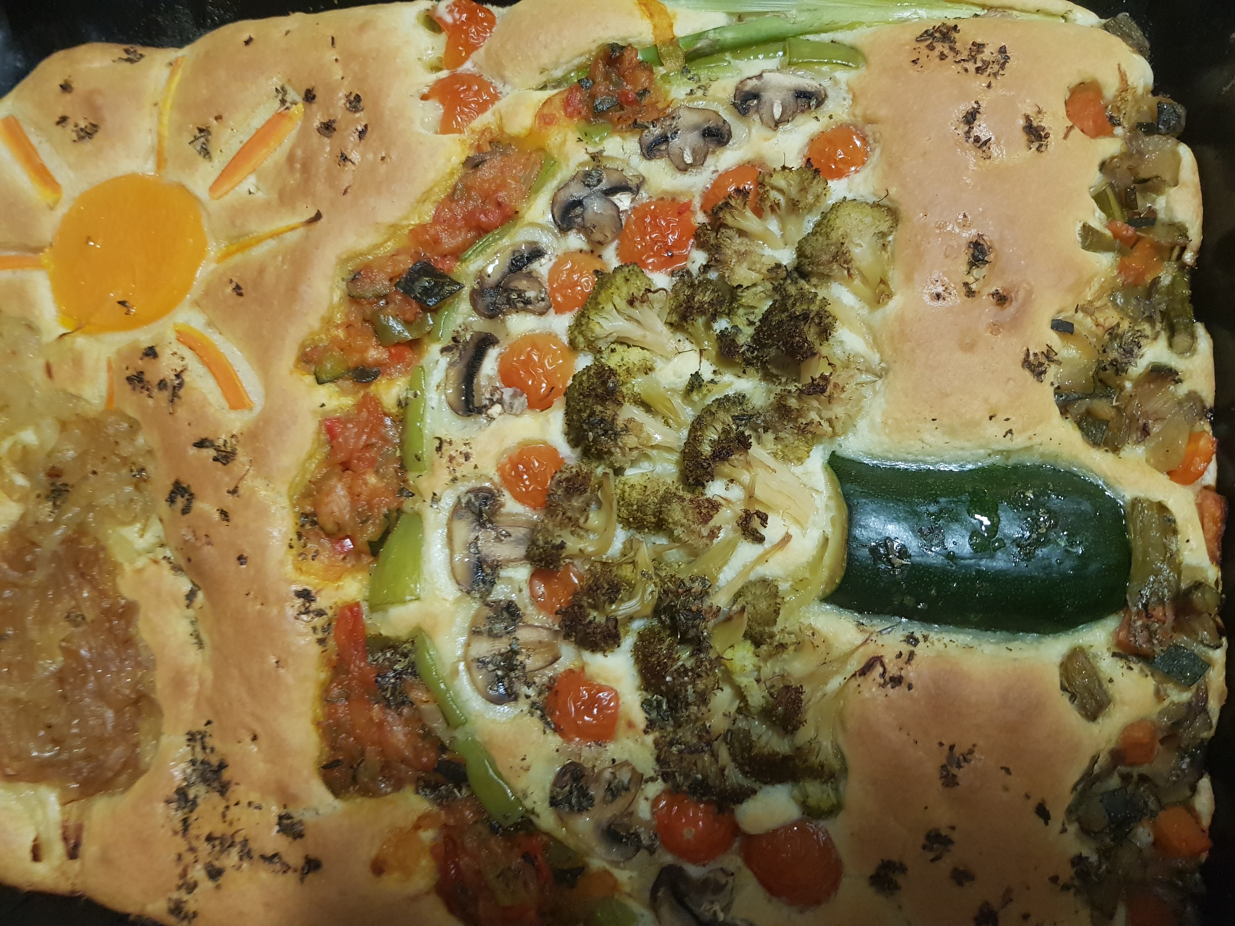 Muy artista no soy, pero bueno para ser mi primera focaccia decorada, quito lo de arte, estoy contenta. Es muy divertido y me lo pasé muy bien. Use para la base la receta de cookidoo Focaccia de cherrys con hiervas provenzales y la decoración con un poco de todo, brócoli, Calabacin, zanahoria, tomates cherrys, champiñones, espárragos trigueros, calabaza para el sol, las nubes las hice con cebolla caramelizada, use también pisto que tenía y verduras salteadas. Bueno y este es el resultado. Para comer 4 de sobra