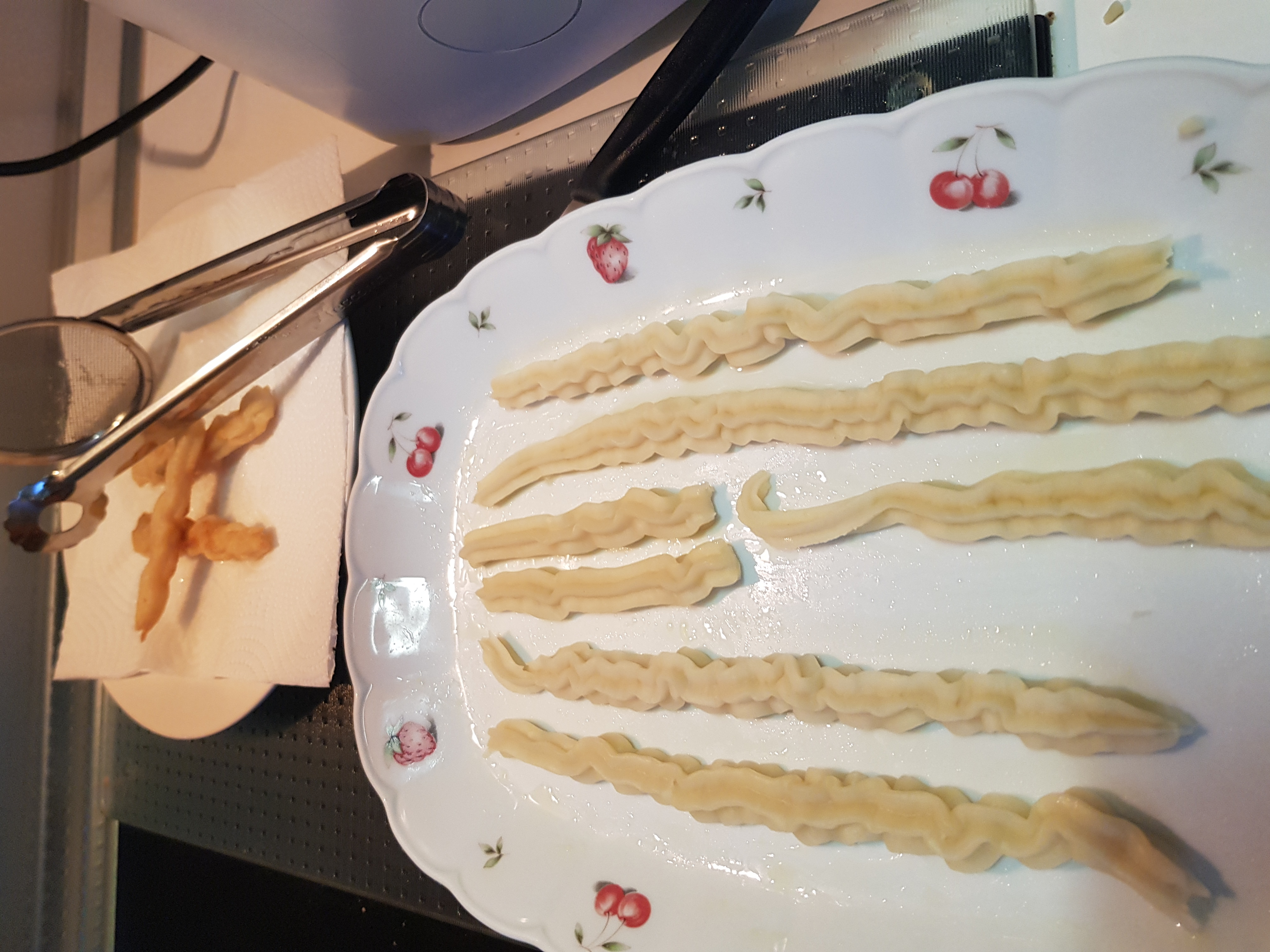 Untar una bandeja con un poco de aceite. Ir poniendo los churros en la bandeja, para que luego sea más fácil añadir en el aceite bien caliente. Para mi es mucho más cómodo calentar el aceite en una cazuela. Sacar a un plato con un papel de cocina para que empape el aceite y espolvorear de azúcar.