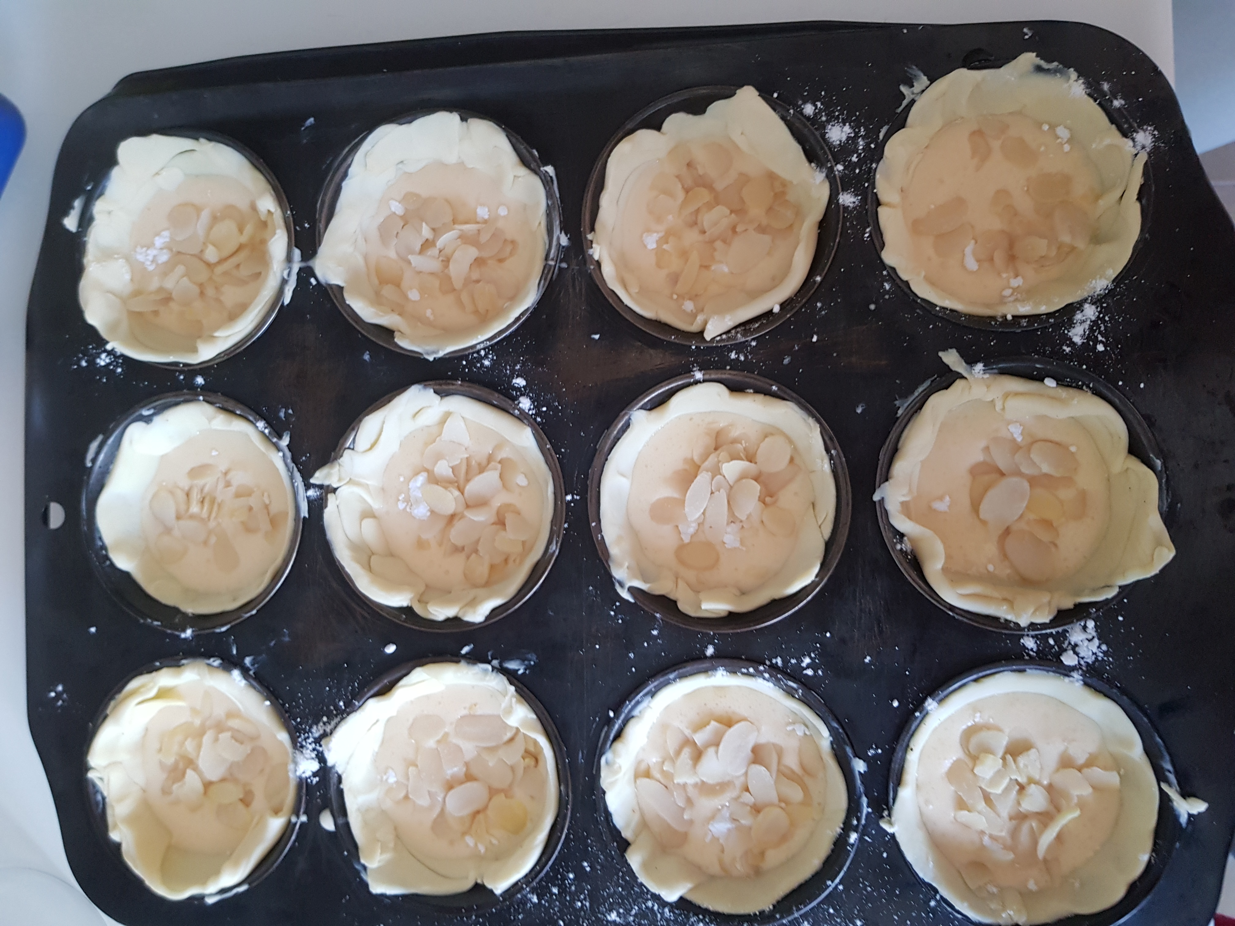 -Poner la mezcla en los moldes, espolvorear el azúcar reservado sobre los moldes y cubrirlos con la almendra fileteada.